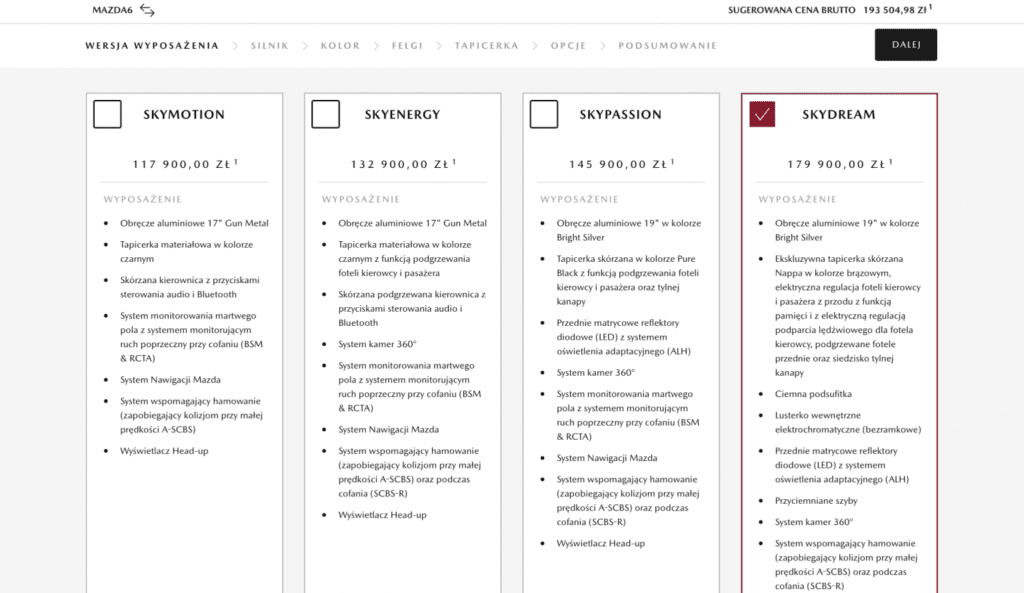 Kolejnym przykładem up-sellingu mogą być oferty dealerów samochodowych. Wartość koszyka podnoszona jest poprzez sugerowany wybór wyższego wariantu wyposażenia, zawierającego znacznie więcej dodatkowego wyposażenia i mocniejszy silnik.